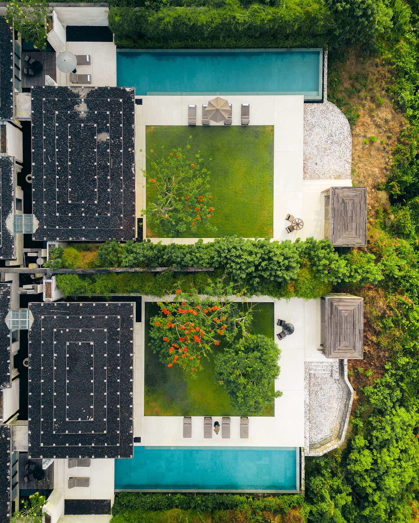 Bayangkan diri Anda dikelilingi oleh taman pribadi yang rimbun, merasakan kesegaran alam di kamar mandi yang menawarkan pemandangan hijau yang menyejukkan. Jendela-jendela besar yang menghiasi vila memungkinkan angin tropis berhembus lembut, menambah kenyamanan dan kesegaran saat Anda bersantai. Di kolam renang pribadi tanpa batas, Anda dapat menikmati momen intim sambil menyaksikan panorama Samudra Hindia yang memukau. Saat malam tiba, halaman tengah vila menjadi tempat yang sempurna untuk berbaring di bawah taburan bintang yang gemerlap.